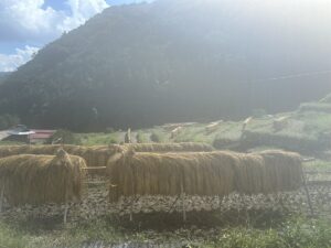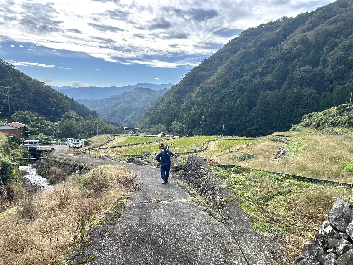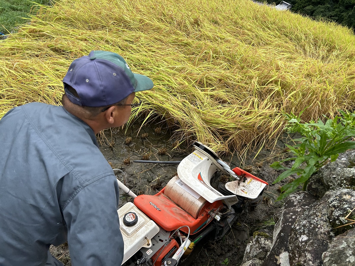 水口から雨水がながれこんでいたハプニングもあり、じゅるくバインダーが走れるかひやひやしましたが心配はいりませんでした!ただ、機械刈りができても機械の入ることのできない畔際の1条(一列)は手刈りであったり、手作業と人手が欠かせない共同作業であることがよくわかりました。