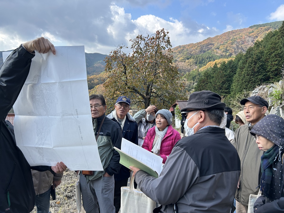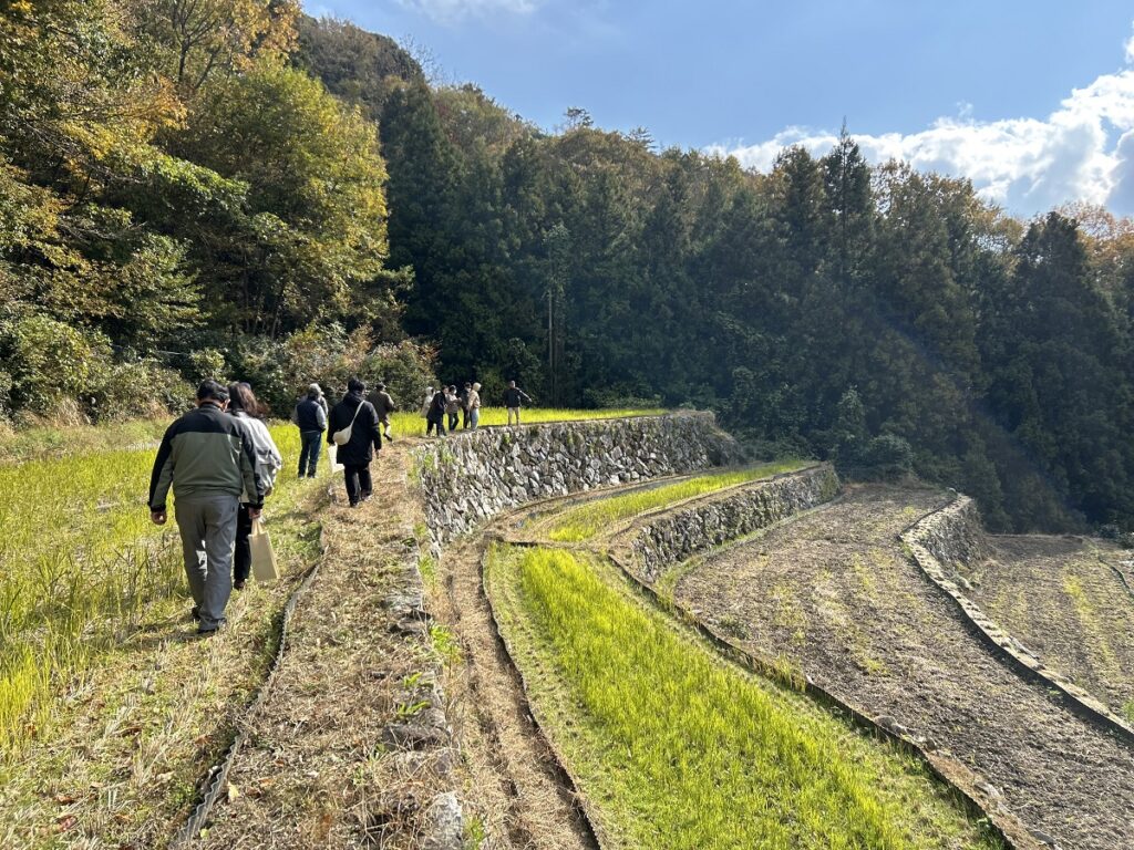 風に冷たい小雨ではありましたが、「助はんどうの会」の三浦会長や村上氏に迎えられ、見晴らしの良い場所についたころには雨も上がり陽も差し込み、皆さん散策されながら棚田の景観・水利畜道・会の名前の所以となった“はんどう(水がめ)”などを見学され、鳥獣被害対策やお米の品種について意見交換なども楽しまれていました。