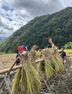草取りから2ヶ月たち、金色に実った穂を鎌で一生懸命刈り取っていきました。思いのほか量が多く、バインダーも途中登場し使い方を教わりながら機械刈りも経験できました。