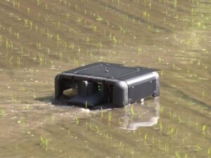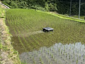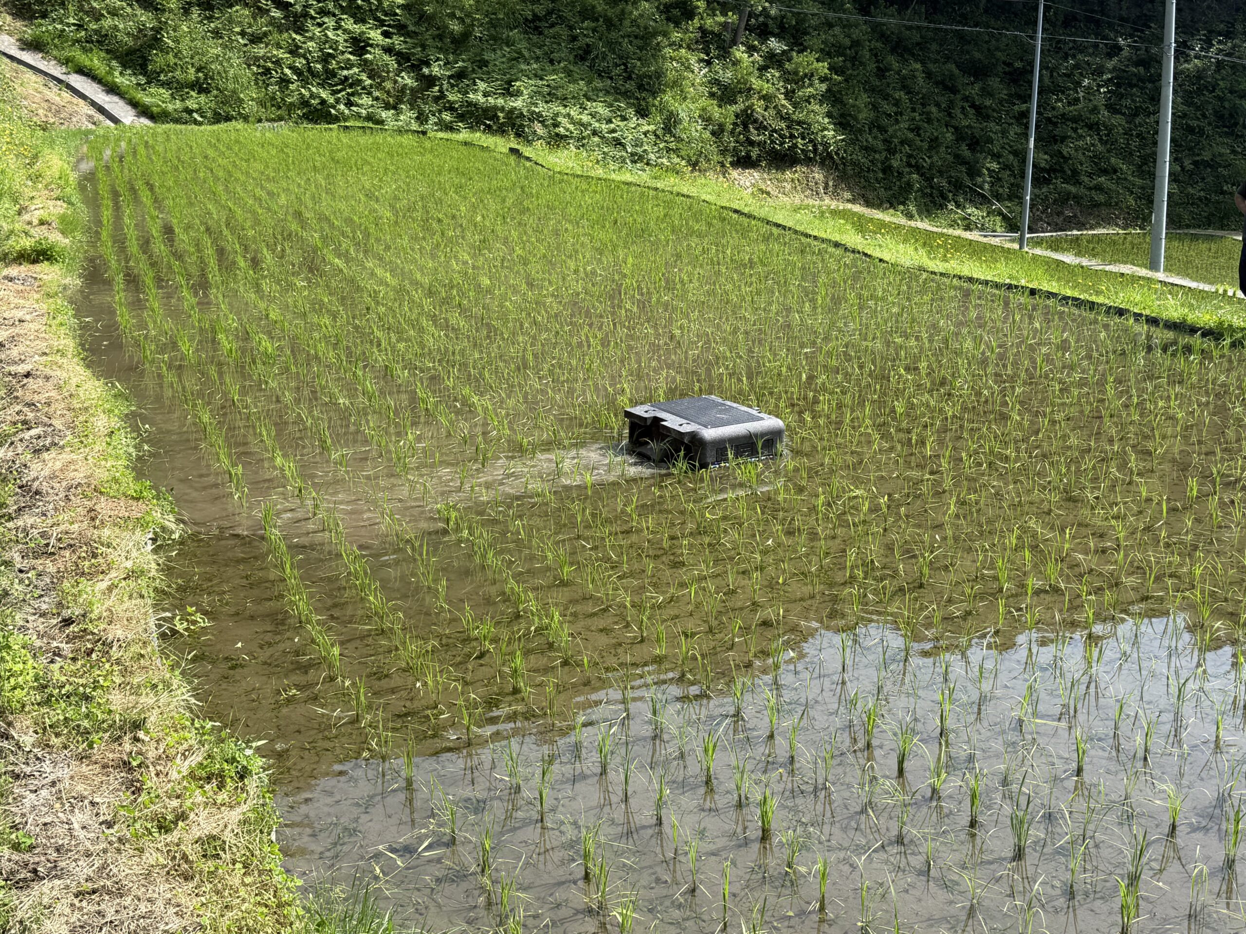 有機米の栽培で一番課題になるのが雑草対策。坂本ではアイガモロボを使って抑草をしています。アイガモロボはブラシを回転させ、田んぼの水を濁らせることで雑草の生育を抑えます。