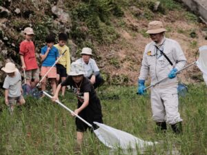 調査は2つのチームに分かれて捕虫網やたも網を使って虫やカエルなどを捕まえ、生き物博士と一緒に観察しました。