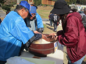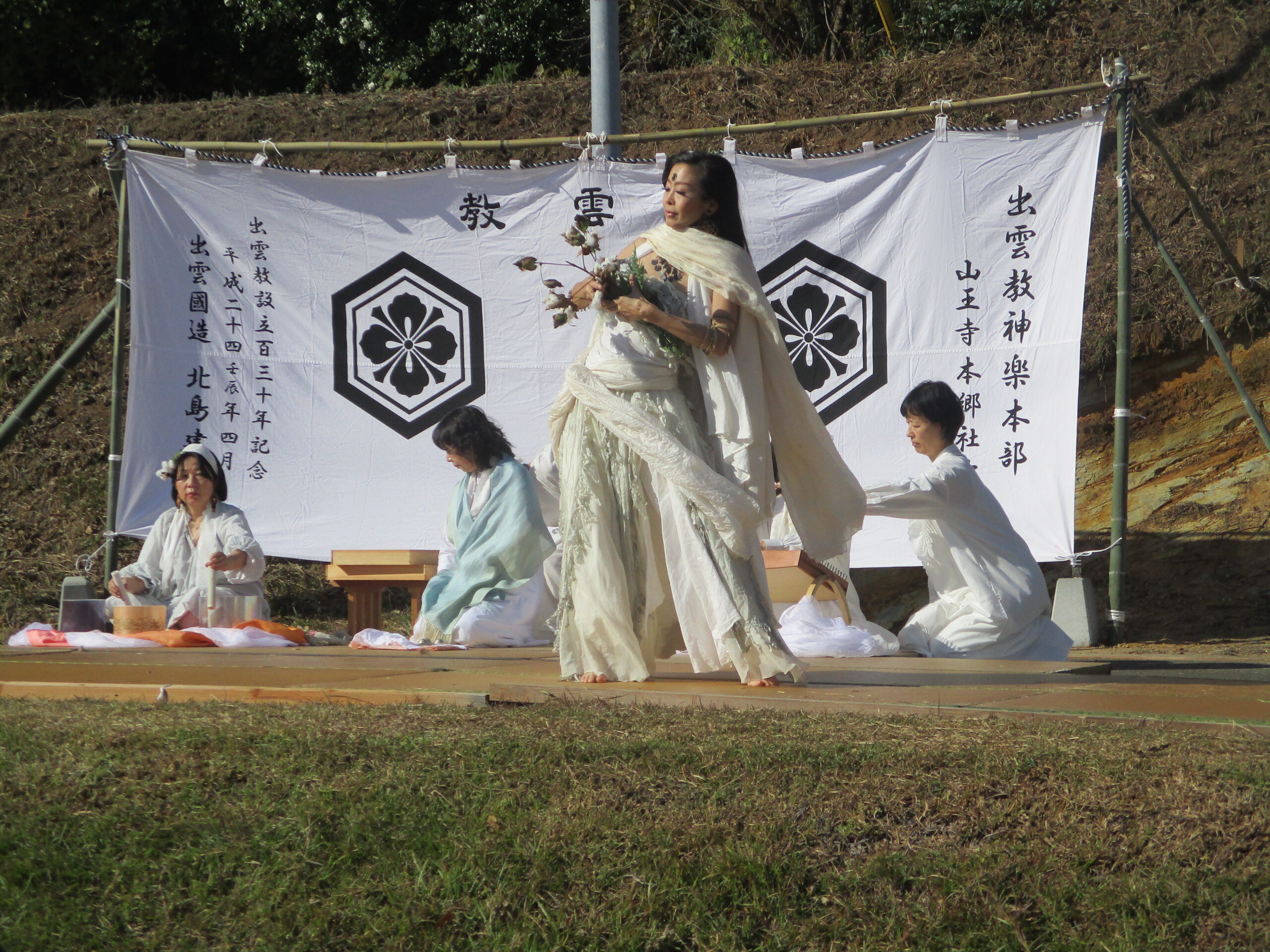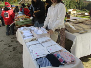 お祭りでは、野菜、米、おにぎりセット(釜炊きのごはん、お味噌汁、おかず)などの農産物の販売や、山王寺の棚田で栽培した綿を使った衣料品やマコモを使った商品などの販売、餅まき、米のすくいどり、ダンスなどが行われました。