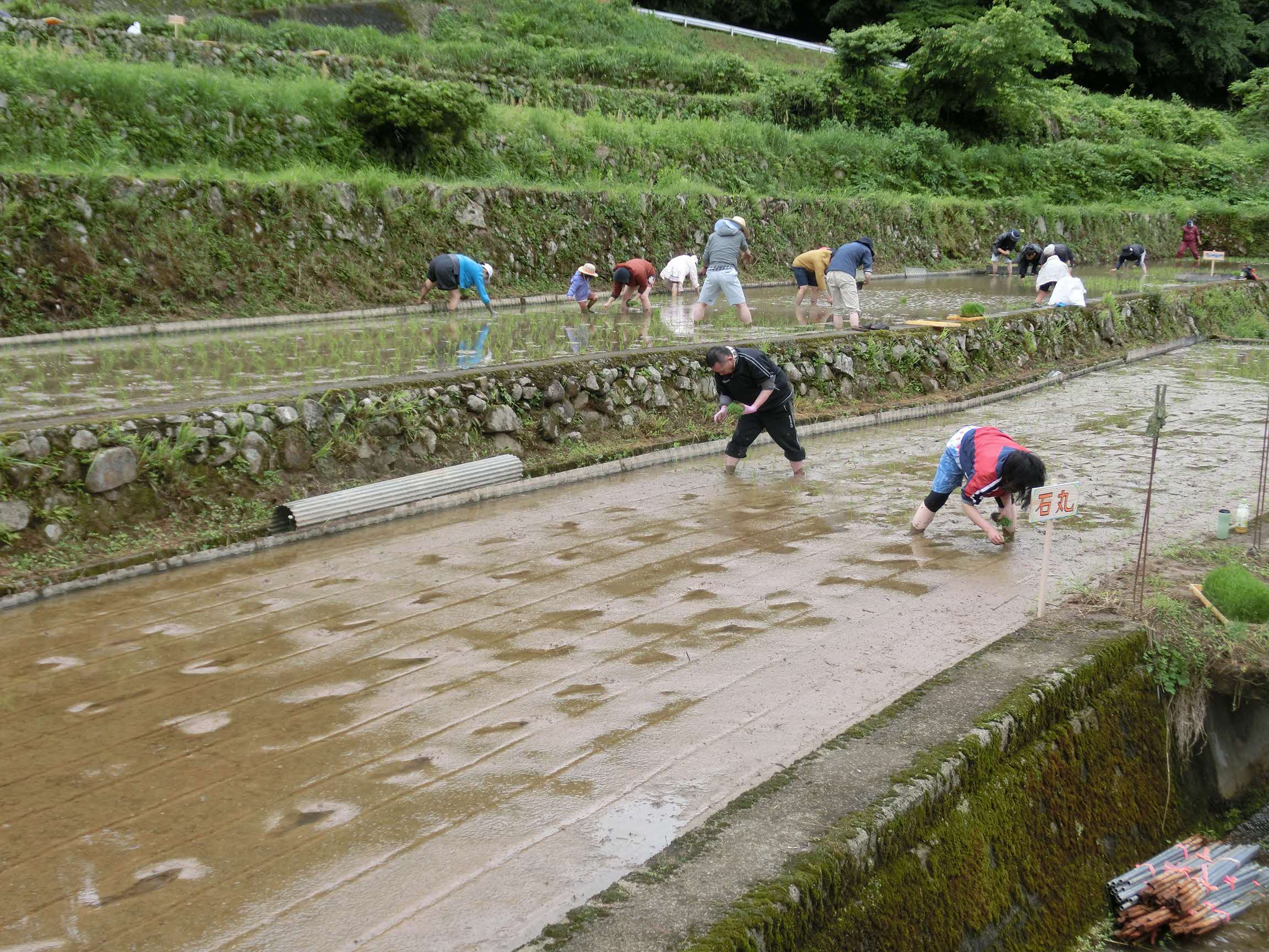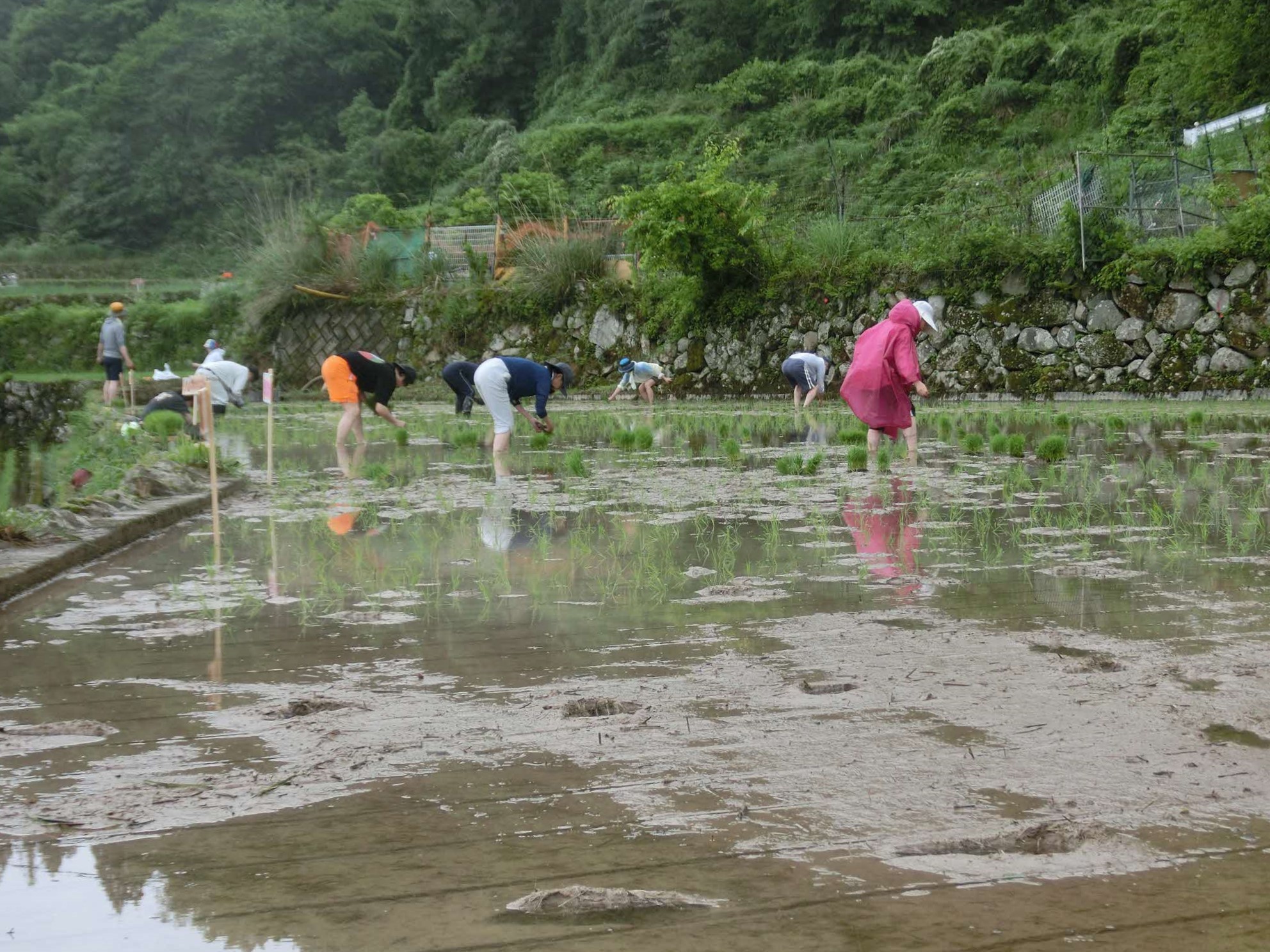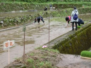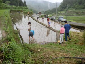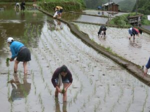 令和7年5月25日(日)に、「棚田オーナーによる田植え」を開催しました。 晴天ではありませんでしたが、無事に田植えを終えることができました。 常連のオーナーさんも多いので、慣れた様子の方もたくさんおられました。